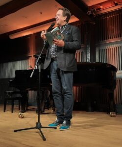 Er bietet dem Publikum auch eine kurze Lesung aus seinem Buch „Klappstuhl und ich!“.