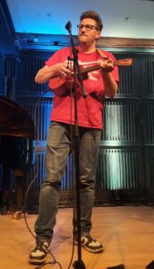 Ihm folgte Pascal Pfeiffer, der das Publikum mit seiner Ukulele und lustigen Liedern zum Mitsingen animierte. Besonders sein Lied „Bierquälerei“ fand bei einem Großteil des Publikums so starken Anklang, dass die Biervorräte an der Bar am Ende des Abends restlos ausverkauft waren.