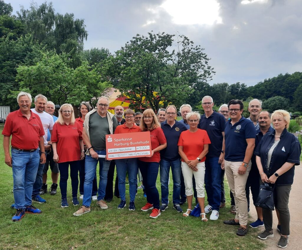 Spendenübergabe durch Markus Kammermeier (Rotary, 3. von rechts), Philip Langhoff (Präsident von Round Table 165, 4. von rechts), Oliver Stein (Präsident von Old Table 165, 6. von rechts), Thomas Kaiser (Lions Club, 9. von rechts), Jan Jürgens (St. Marien, zwischen Ralf Macke und Leonie Fröhlich), Dieter Kindler, Jutta Fricke und Melanie Henn (Konzerte in Winsen e.V., 1., 4. & 5. von links) und weiteren Helfern an Ralf Macke, Leonie Fröhlich und Susanne Uhlig (Mitte mit dem Scheck)